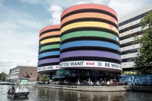 Waterkantgebouw van 18 bij 82 meter volledig in Pridekleuren: ‘Hoe groter de vlag, hoe krachtiger de boodschap’