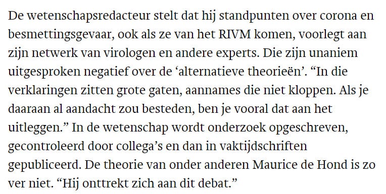 Als ik kom, op basis van internationale bevindingen, die blijkbaar bij de Nederlandse “virologen en andere experts” nog niet zijn doorgedrongen, dan komen ze niet in de Nederlandse media, omdat dezelfde personen zeggen dat het niet klopt. En alle pogingen van mij om met die personen, al dan niet in het openbaar, in debat te komen, lukken niet. Geen medium is erin geinteresseerd. Geen viroloog/expert is ertoe bereid. En dan zou ik me onttrekken aan een debat.