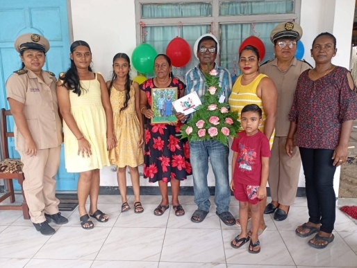 Namens Districtscommissaris Ravi Bhattoe hebben districtssecretaris R.Sarman en adjunct districtssecretaris S.Durga de felicitaties overgebracht aan het jubilerende echtpaar.
