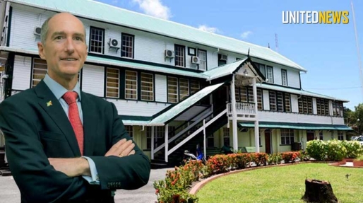 Foto: Alistair Routledge, president van ExxonMobil Guyana. Op de achtergrond het ministerie van Financiën in Guyana. | Bron: OilNow