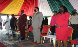 President Chandrikapersad Santokhi en first lady Mellisa Santokhi-Seenacherry hebben de reuze kerstboom op het Onafhankelijkheidsplein gisteravond ontstoken.