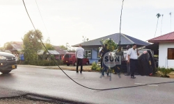 Een dienstvoertuig, welk vermoedelijk diende als volgauto in de colonne van de presidentiële delegatie op weg naar Nickerie, is hedenmorgen over de kop geslagen aan de Catharina Sophiaweg nabij kil