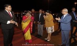 De Indiase president Droupadi Murmu neemt afscheid van de Surinaamse regering op Zanderij (foto: Kab. Pres)