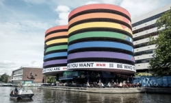 De parkeergarage van Q-Park boven de Waterkant aan de Marnixstraat is ter gelegenheid van Pride Amsterdam volledig gekleurd in de kleuren van de Pride Progress-vlag.
