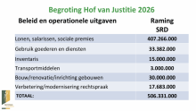 Begroting Hof van Justitie over 2026 is SRD 506 miljoen 03 okt 2025 - 21:00De begroting voor het Hof van Justitie over het jaar 2026, bedraagt iets meer dan SRD 506 miljoen. Hiervan gaat ruim 80% – SRD 407 miljoen – naar lonen, salarissen en sociale premies. De rest is als volgt onderverdeeld:Gebruik goederen en diensten SRD 33 miljoen, Inventaris SRD 15 miljoen, Transportmiddelen SRD 3 miljoen, Bouw/renovatie/inrichting gebouwen SRD 30 miljoen en verbetering/modern