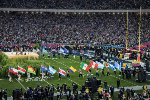 Tijdens de show verschenen op het veld en op de schermen meerdere vlaggen uit de regio, als onderdeel van een bredere boodschap over verbondenheid in ‘de Americas’. In diverse internationale verslagen werd beschreven hoe Bad Bunny het optreden afrondde met een oproep die liefde boven haat plaatst, terwijl vlaggen het beeld domineerden.