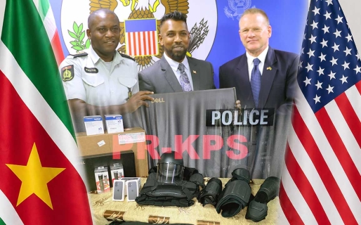 De Chargé d’Affaires van de Verenigde Staten van Amerika (VS), Paul Watzlavick, heeft op woensdag 29 april 2026 een grote partij goederen overhandigd aan de minister van Justitie en Politie, mr H. Monorath, ten behoeve van het Korps Politie Suriname (KPS). De overhandiging vond plaats op het hoofd bureau
