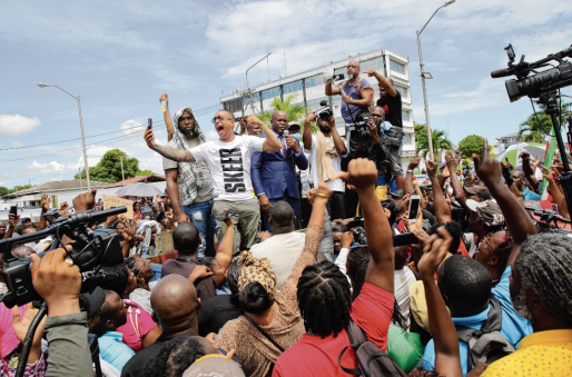 FOTO: De Surinaamse vicepresident Ronnie Brunswijk (midden, in pak met stropdas) spreekt actievoerders toe tijdens een demonstratie in Parmaribo.Foto Ranu Abhelah/ANP