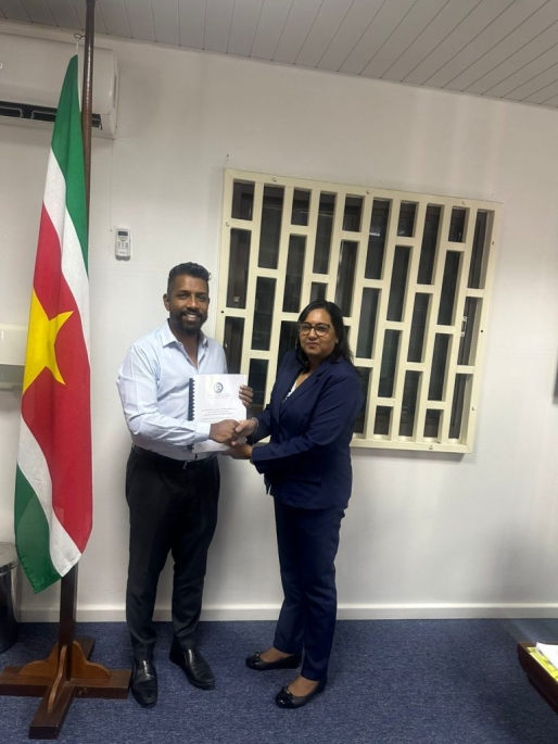 PARAMARIBO – Op dinsdag 24 maart 2026 heeft mw. Bidiawatie Harpal haar eindwerkstuk van de Post-Master opleiding Wetgeving officieel overhandigd aan de Minister van Justitie en Politie, mr. Harish S. Monorath.
