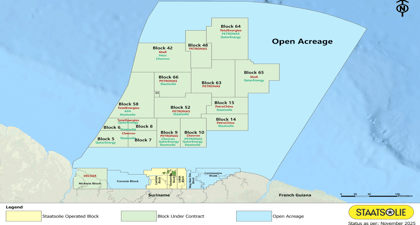 Blok 52 beslaat ongeveer 4.750 vierkante kilometer, met waterdieptes variërend van zestig tot duizend meter, en ligt op zo’n 140 kilometer uit de Surinaamse kust.