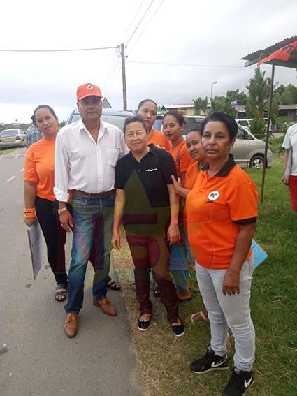 Een seniore vrouw staat op straat en is bezig Harriet Ramdien, lijsttrekker van de VHP in Nickerie te promoten. Aan Starnieuws zegt Ramdien dat de opkomst zeer goed is. Covid-19-regels worden in acht genomen. “Oranje is hier