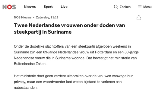 De familie van de 80-jarige Edith Brammerloo, een van de twee Nederlandse vrouwen die in de nacht van zaterdag op zondag 28 december 2025 in Suriname doodgestoken werden door de 43-jarige Dennis Aroma, heeft laten weten dat de berichtgeving van de NOS -dat nabestaanden worden bijgestaan- niet klopt.