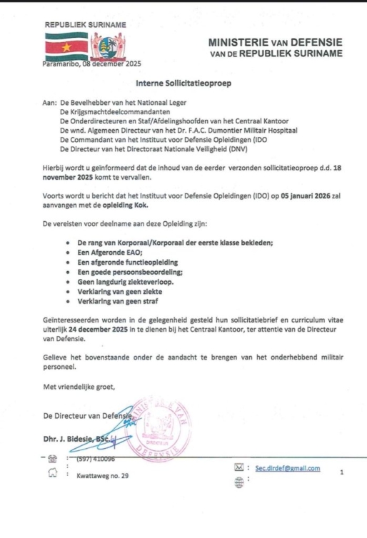 Minister Uraiqit Ramsaran van Defensie hecht groot belang aan de ontwikkeling en opleiding van het personeel. Het benutten van interne sollicitatiemogelijkheden is een belangrijk instrument om de capaciteiten van onze militairen verder te versterken en hun loopbaanmogelijkheden binnen Defensie te vergroten.