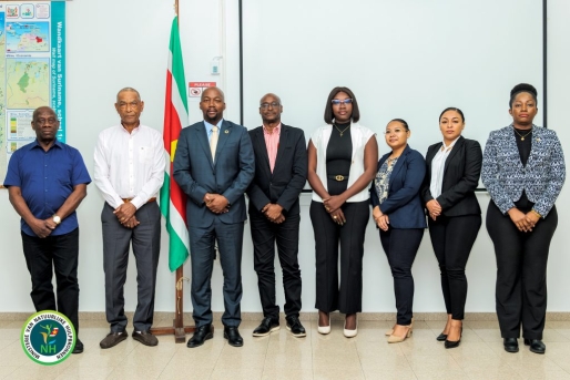 Van links naar rechts: Freddy Crisis, Rudiwal Baarh, Minister David Abiamofo, Ronald Rozenblad, Keshian Joekoe, Sacha Mertowirijo, Sharmaine Artist en Alice Amafo