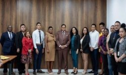 Foto: President Chandrikapersad Santokhi en voorzitter Urmila Ramlagansingh samen met de leden van het Coördinatie Bureau.