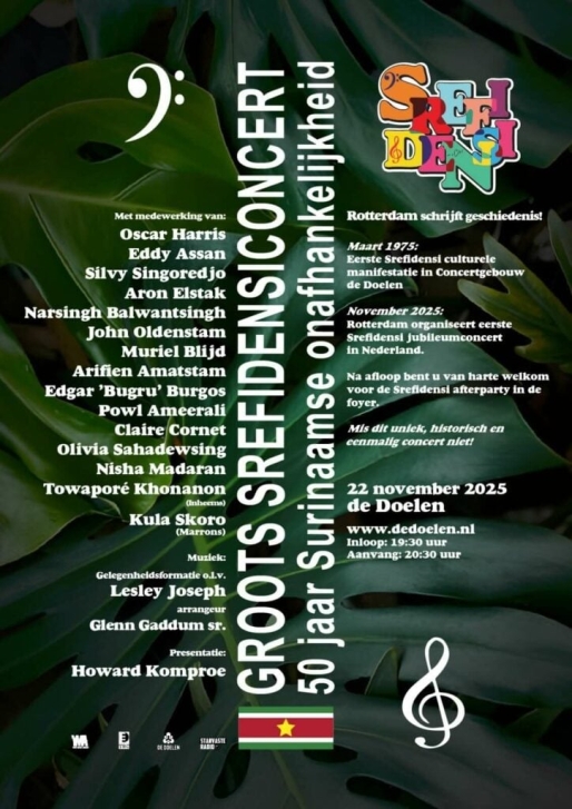 Historisch verbandHet jubileumconcert verwijst naar een belangrijk moment in de gedeelde geschiedenis. Op Paaszondag 30 maart 1975, vond in de Doelen de eerste nationale culturele manifestatie plaats op weg naar Srefidensi, de Surinaamse onafhankelijkheid, die door 1000 Surinamers bezocht werd. Ook de toenmalige Surinaamse premier Henck Arron, die in Nederland verbleef
