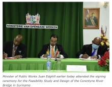Historische bewegwijzering baant weg voor Corentyne River Bridge die Guyana en Suriname met elkaar verbindt 04 mei 2022 - 21:27Guyana's minister van Openbare Werken Juan Edghill woonde eerder vandaag de ondertekeningsceremonie bij voor de haalbaarheidsstudie en het ontwerp van de Corentyne River Bridge in Suriname.