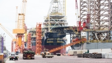 Foto: De Tullow Oil Prof. John Evans Atta Mills drijvend productieopslag- en losschip aangemeerd op de Sembcorp Marine Tuas-scheepswerf in Singapore. Nicky Loh | Bloomberg | Getty Images