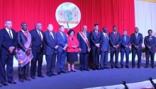 BRUNSWIJK DOET VIA AMBASSADEUR HANDREIKING AAN PRESIDENT ZUID-AFRIKA 24 apr 2024 - 16:38Fotocompilatie: Vicepresident Ronnie Brunswijk, ambassadeur Fidelia Graand-Galon en Cyril Ramaphosa, president van Zuid-