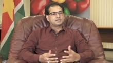 Minister Soeresh Algoe van Landbouw Veeteelt en Visserij (LVV) geeft in gesprek met het Nationaal Informatie Instituut (NII) een uiteenzetting over het Patamacca Palmolieproject.