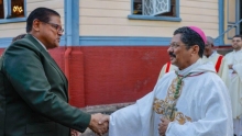President Santokhi werd welkom geheten door bisschop Choennie. Foto: CDS