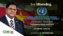 Mededeling: President Chandrikapersad Santokhi LIVE vanuit USA 21 september 2022 om 11:15 21 sep 2022 - 14:25President Chandrikapersad Santokhi zal vandaag, woensdag 21 september 2022 om 11:15 uur een statement geven tijdens de 77e Algemene Vergadering van de Verenigde Naties in New York.