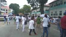 Personeel ‘s Lands Hospitaal is situatie zat: “We kunnen niet eens eten meer kopen” 19 jul 2022 - 06:15Het personeel van het ‘s Lands Hospitaal trok vandaag ook de straat op. Zij is ontevreden over de situatie in het land.