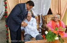 President feliciteert echtpaar met 80-jarig huwelijk 09 feb 2025 - 16:50President Chan Santokhi feliciteert het echtpaar Gangapersad-Badripersad met het eiken huwelijk. Dit paar is 80 jaar gehuwd. Het feest is zaterdag gevierd in het district Nickerie.