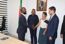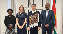 Jarige DSB gedenkt alle baby's die vandaag geboren worden 19 jan 2025 - 20:19De leiding van DSB overhandigt moeder Doekoe een cadeaupakket. Zij is in 's Lands Hospitaal bevallen. Van l-r: Alexander van Petten (COO), Ashna Kamta (CRO) en Waldo Halfhuid (CFO).