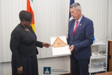 Numismatisch Museum krijgt bijzondere artefacten in bruikleen 21 nov 2024 - 02:42Cees Ullersma, hoofd International Relations van DNB (l), de Nederlandse ambassadeur Walter Oostelbos (m) en Governor Maurice Roemer van de Centrale Bank van Suriname (r) bekijken de artefacten die in bruikleen zijn gegeven.