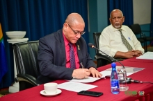 In november start vaktrainingen SAO in Albina 24 okt 2024 - 01:37Minister Steven Mac Andrew (aan het hoofd van de tafel) in gesprek met de werkgroep Albina en Ontwikkeling. Het project Wroko Foe Mek Moni van het ministerie van Arb