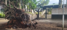 Mahonieboom valt om en vernielt schutting bij DNA-gebouw 19 jun 2025 - 23:29Bij het gebouw van De Nationale Assemblée in Suriname (DNA) is vanmiddag een mahonieboom omgevallen. Daarbij is een schutting vernield.Op bovenstaande foto is te zien dat het om een grote boom gaat, die is omgevallen en dwars over een toegangspoort ligt.De mahonieboom is met wortel en al te losgeraakt uit de grond, wat erop wijst dat de bodem mogelijk verzadigd of instabiel was — mogelijk door