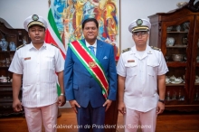 Wongsodikromo en Kasanmoesdiran districtscommissarissen Saramacca en Coronie 19 mrt 2025 - 05:30De nieuwe dc's Rianto Kasanmoesdiran (l) en Mitchel Wongsodikromo (r) worden geflankeerd door president Chandrikapersad Santokhi. [Foto: kabinet van de president]