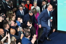 Duitse conservatieven winnen verkiezingen 24 feb 2025 - 06:54De Duitse conservatieve kandidaat voor bondskanselier en leider van de Christlich Demokratische Union (CDU), Friedrich Merz, en Markus Soeder, premier van de deelstaat Beieren en leider van de Christlich Demokratische Union (CSU), betreden het podium nadat de exitpollresultate