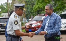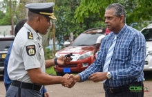 Korps Politie neemt nog eens 15 auto's in ontvangst 21 feb 2025 - 00:43Korpschef Bryan Isaacs overhandigt de sleutels van de auto's aan Directeur Operationele Diensten, Bieswadath Somai. De mobiliteit van de politie is vergroot met de auto's.