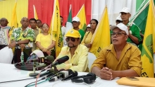 Reyme: A20 heeft een deel van de waarborgsom moeten lenen 21 feb 2025 - 04:57De voorzitters Steven Reyme (A20), Gerold Sewcharan (PRO) en Steven Alfaisi (DOE) staan journalisten te woord na de registratie. Onder de vlag van A20 doen de partijen mee aan de verkiezingen. (Foto: René Gompers)