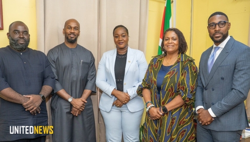 FOTO BIJSCHRIFT: Minister Miquella Huur in constructief beraad met Olusegun Oyewole, Ejike Iheme, Raymond Ward en Dawn Simpson over de miljardensteun aan Suriname.