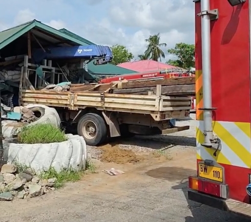 Op de foto is te zien hoe de pick-up, geladen met houten palen, frontaal tegen een gebouw is gereden en zich deels onder het dak heeft vastgezet. Het dak van het pand is zwaar beschadigd en hangt scheef omlaag door de klap.